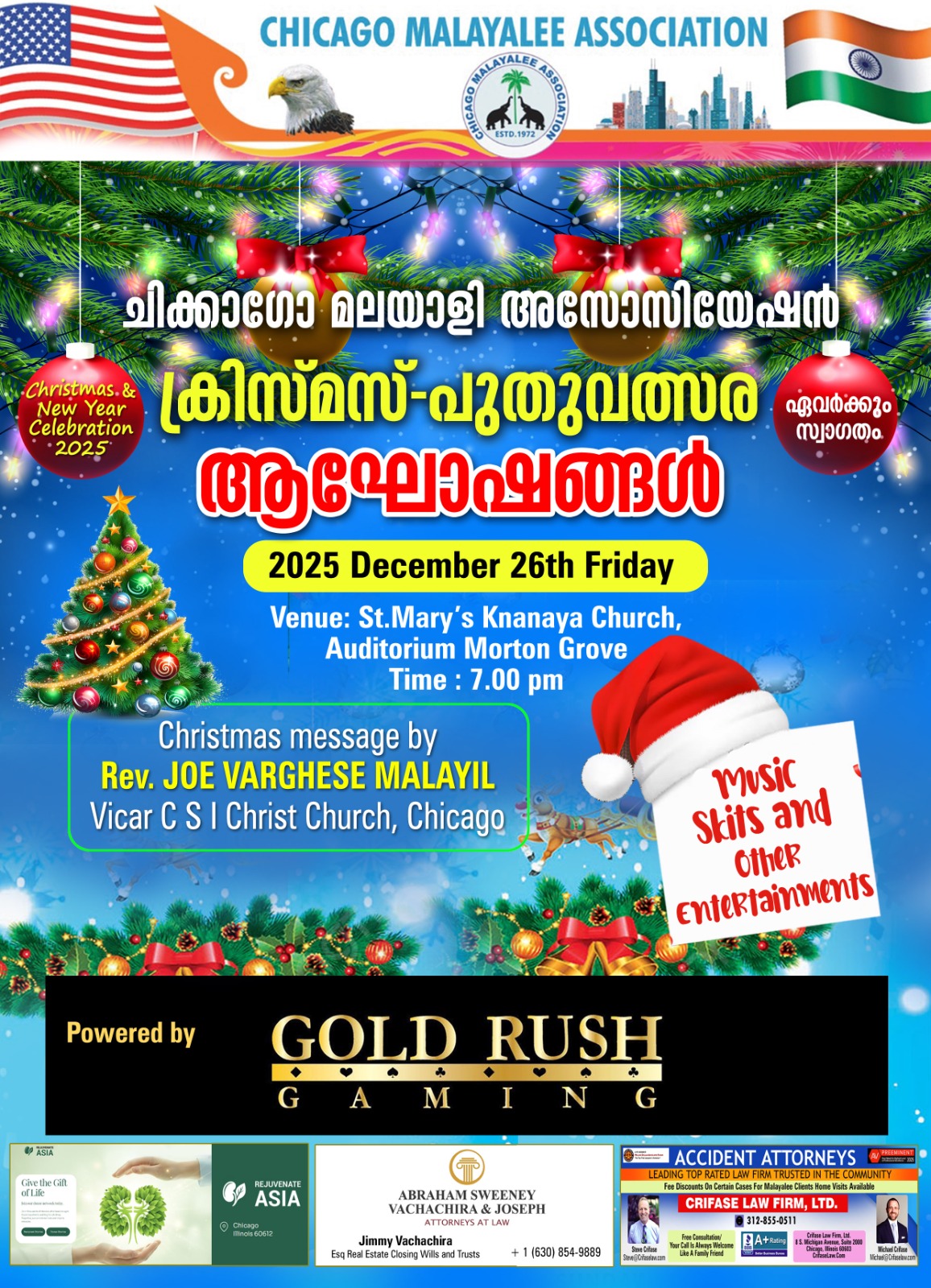 ചിക്കാഗോ മലയാളി അസോസിയേഷന്റെ ആഭിമുഖ്യത്തിൽ നടത്തപ്പെടുന്ന ഈ വർഷത്തെ ക്രിസ്മസ് പുതുവത്സരാഘോഷങ്ങൾ ഡിസംബർ 26 വെള്ളിയാഴ്ച്ച വൈകിട്ട് 7 മണിക്ക് മോർട്ടൻ ഗ്രോവിലുള്ള സെന്റ് മേരീസ് ക്നാനായ ചർച്ച് ഓഡിറ്റോറിയത്തിൽ വെച്ച് നടത്തപ്പെടുന്നതാണ് .ക്രിസ്മസ് ഗാനാലാപനം ,സ്കിറ്റുകൾ,നൃത്തം ഉൾപ്പെടെ നിരവധി കലാപരിപാടികളോടു കൂടി നടത്തപ്പെടുന്ന പരിപാടിയിൽ ചിക്കാഗോ സി എസ് ഐ ക്രൈസ്റ്റ് ചർച്ച് വികാരി റെവ ജോ വർഗീസ് മലയിൽ ക്രിസ്മസ് സന്ദേശം നൽകും . ഈ ആഘോഷ പരിപാടികളിലേക്ക് എല്ലാ മലയാളി സുഹൃത്തുക്കളെയും ക്ഷണിക്കുന്നതായി സംഘാടകർ അറിയിച്ചു .